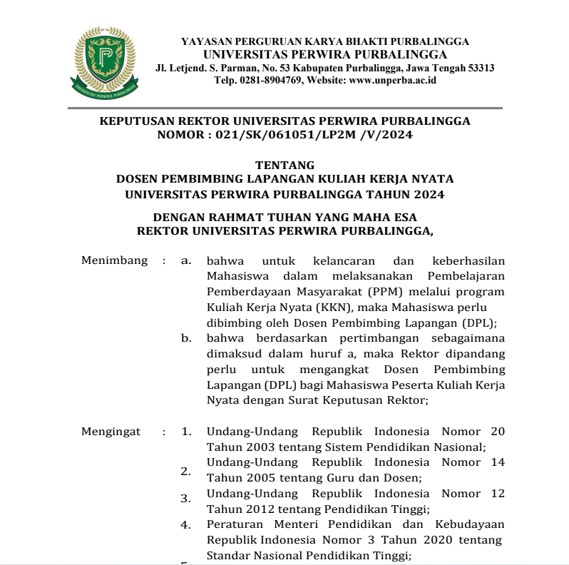 Diberitahukan kepada calon peserta KKN Tahun Akademik 2023/2025 Universitas Perwira Purbalingga. Berikut kami sampaikan Surat Keputusan tentang Daftar Peserta KKN dan Dosen Pembimbing Lapangan, bisa dilihat pada berikut ini :