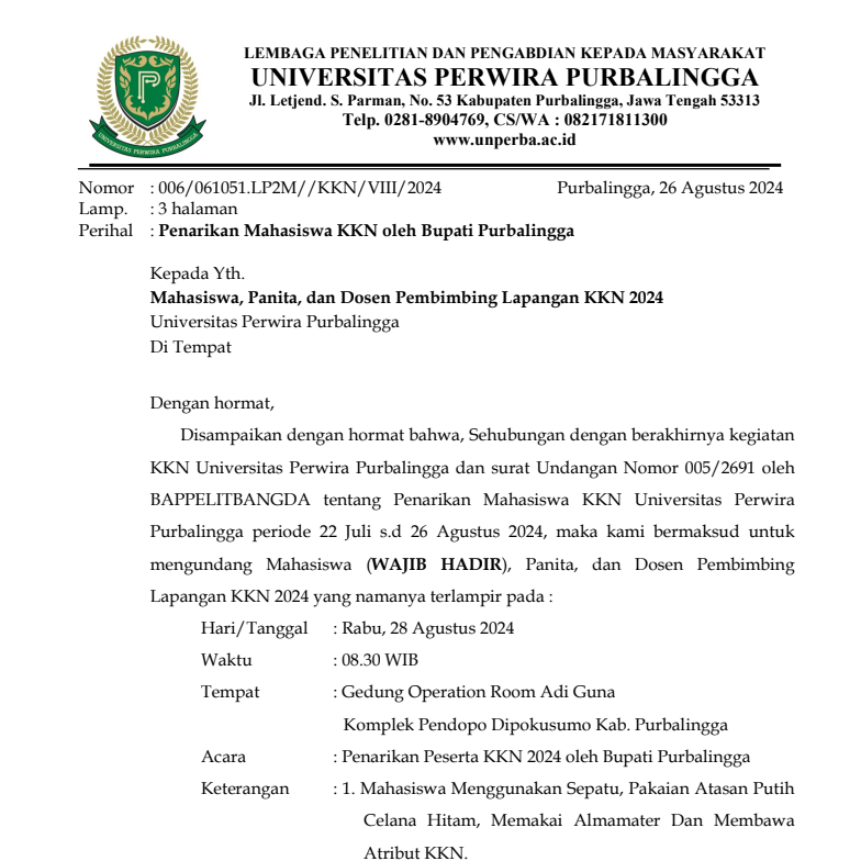 Disampaikan dengan hormat bahwa, Sehubungan dengan berakhirnya kegiatan KKN Universitas Perwira Purbalingga dan surat Undangan Nomor 005/2691 oleh BAPPELITBANGDA tentang Penarikan Mahasiswa KKN Universitas Perwira Purbalingga periode 22 Juli s.d 26 Agustus 2024, maka kami bermaksud untuk mengundang Mahasiswa (WAJIB HADIR), Panita, dan Dosen Pembimbing Lapangan KKN 2024 yang namanya terlampir pada :
